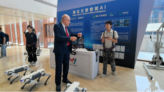 展会现场,国际旅游联合会主席埃里克·杜吕克特地来到鄂旅股份展区,对智能设备终端表现出极大的兴趣。杜吕克与机器狗互动并和工作人员进行亲切交流,对此次参展的智能设备给予了高度评价。
