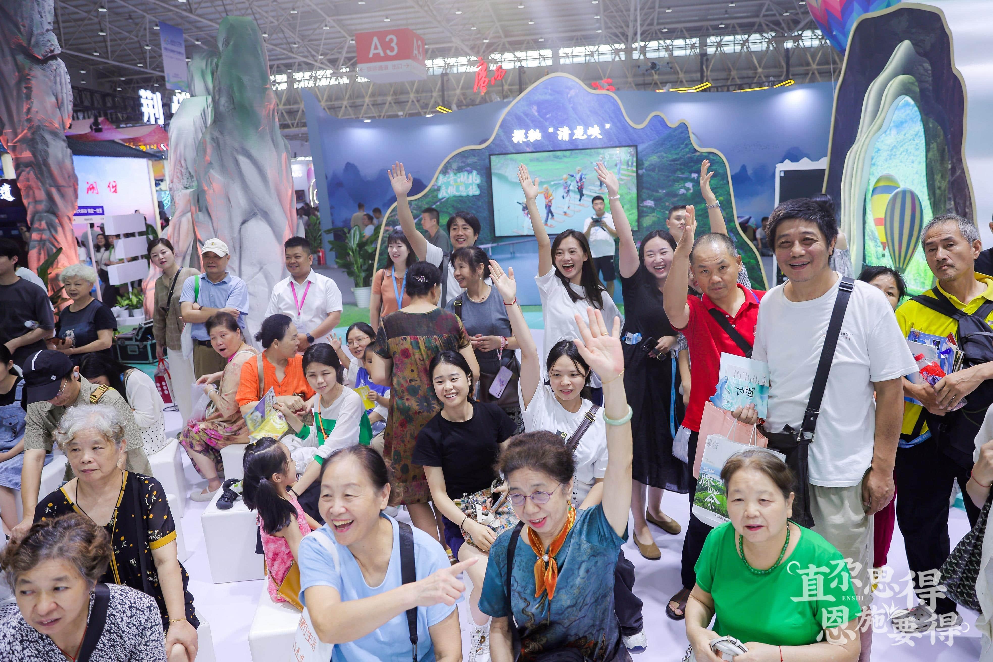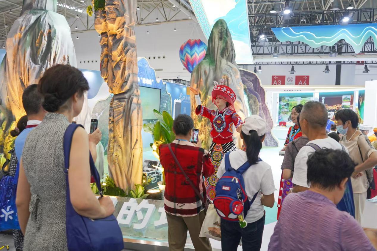 本次展区设计独具匠心,以景区标志性的喀斯特地貌为灵感,通过逼真的场景还原和多媒体展示,让观众仿佛置身于峡谷深处。展区入口,巨大的“一炷香”模型直插云霄,AI机器人歌舞频繁互动,吸引不少观众合影留念;展区中心LED屏滚动播放,全方位展示峡谷的多元魅力。
