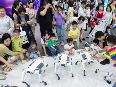 智能机器狗团队成为展区明星,它们不仅能够进行舞蹈表演,这些搭载AI算法的机器狗具备行李驮运、环境清洁能力,并通过红外感知与声光预警系统执行夜间巡逻等景区运营任务。展会现场,机器狗的互动表演吸引了大量观众驻足观看。与会嘉宾纷纷拿出手机记录这些智能机器人为文博会带来的科技魅力,亲身体验科技与文旅融合的创新成果。