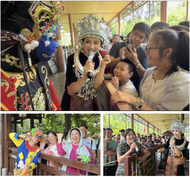 将文化场景化,场景体验化。在旅游旺季,游客排队等候的枯燥感常常影响整体游玩体验。通过巧妙转化这一“等待环节”,打造成为沉浸式互动体验场景。在地面缆车、索道广场等排队区域,以“慢行觅趣、山野游之”为主题,策划了杂技表演、舞蹈演艺、非遗文化展演、脱口秀等一系列丰富多彩的活动,让游客在排队间隙也能感受到欢乐与文化魅力,有效缓解了焦躁情绪,提升了游客对景区游览的满意度。