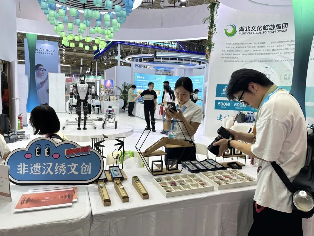 文博会上,酒店集团展区集中展示了集团的业务布局与综合实力,并为今年全新孵化的自有品牌“丹籁”策划了一次特别的亮相:源自汉绣的精美纹样延伸到潮流发饰、挎包上,让千年楚韵成为可穿搭、可带走的具体符号。这些展品是丹籁将江城文化“翻译”为旅居体验的重要载体,也是酒店重要的互动体验元素之一,旨在让宾客深度感受在地文化的魅力。
