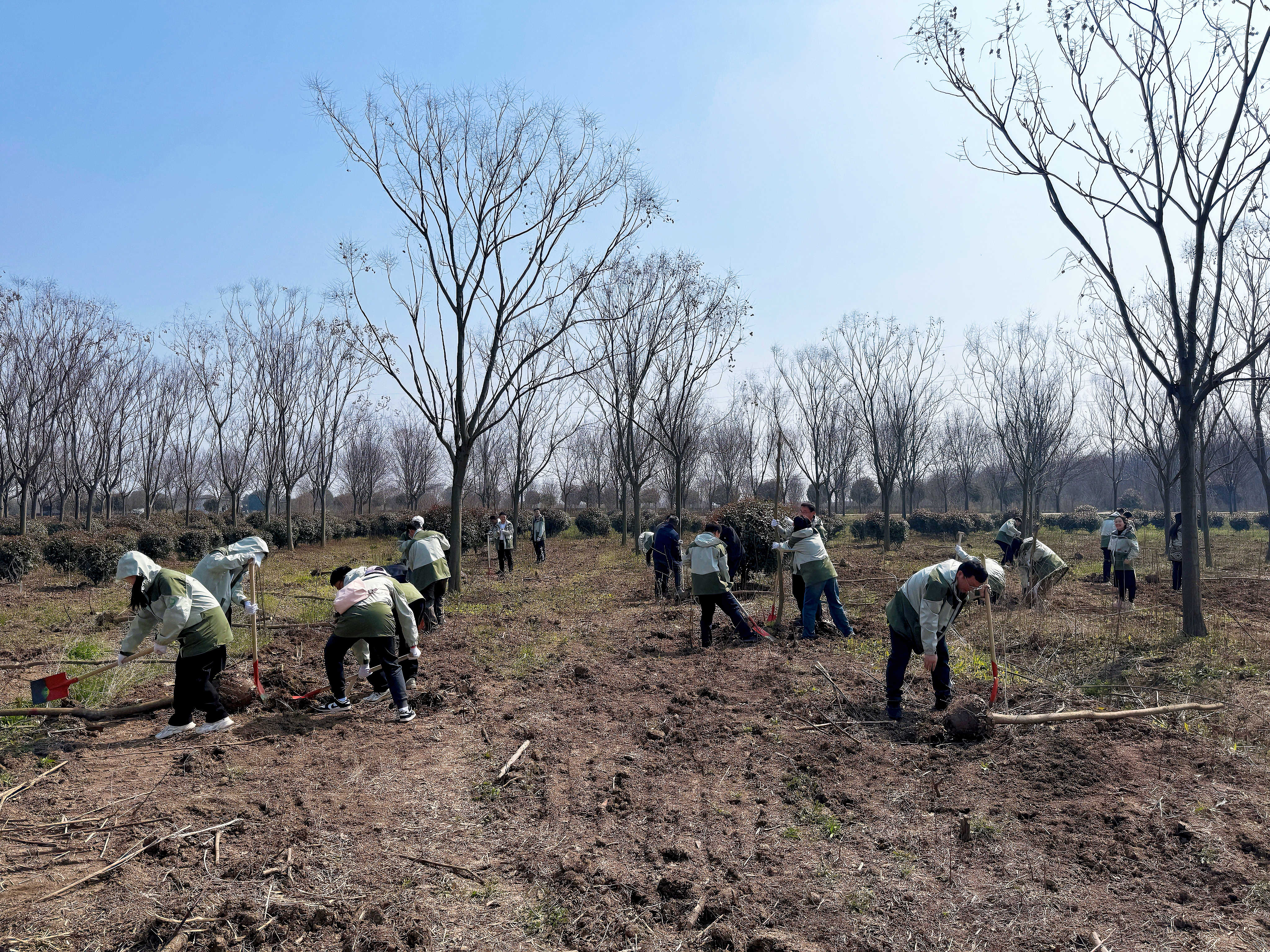 公司党总支书记、董事长董良宇同志与职工一同挥锹培土,并亲切交流。党总支委员、副总经理陈刚、谭兴同志一同参与植树劳动。