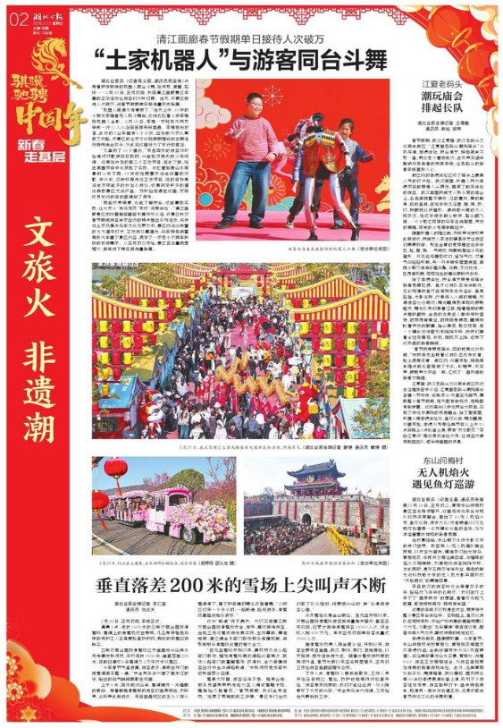 湖北日报讯 (记者陈义超、通讯员杨金艳)与身着民族服饰的机器人同台斗舞,抢绣球、套圈、拓印……2月20日,正月初四,长阳清江画廊景区丰富的互动活动让游客们大呼过瘾。当天,该景区接待人次破万,创春节假期单日接待量历史新高。