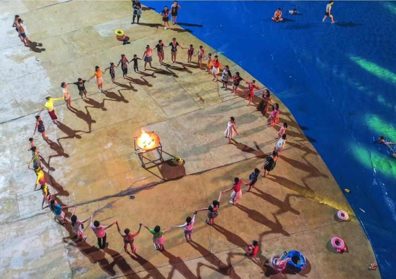 此外,水上乐园还为游客们准备了丰富多样的互动活动。特色傣族歌舞表演、有奖互动、竹竿舞、篝火晚会等,引来游客好评连连,欢声不断。