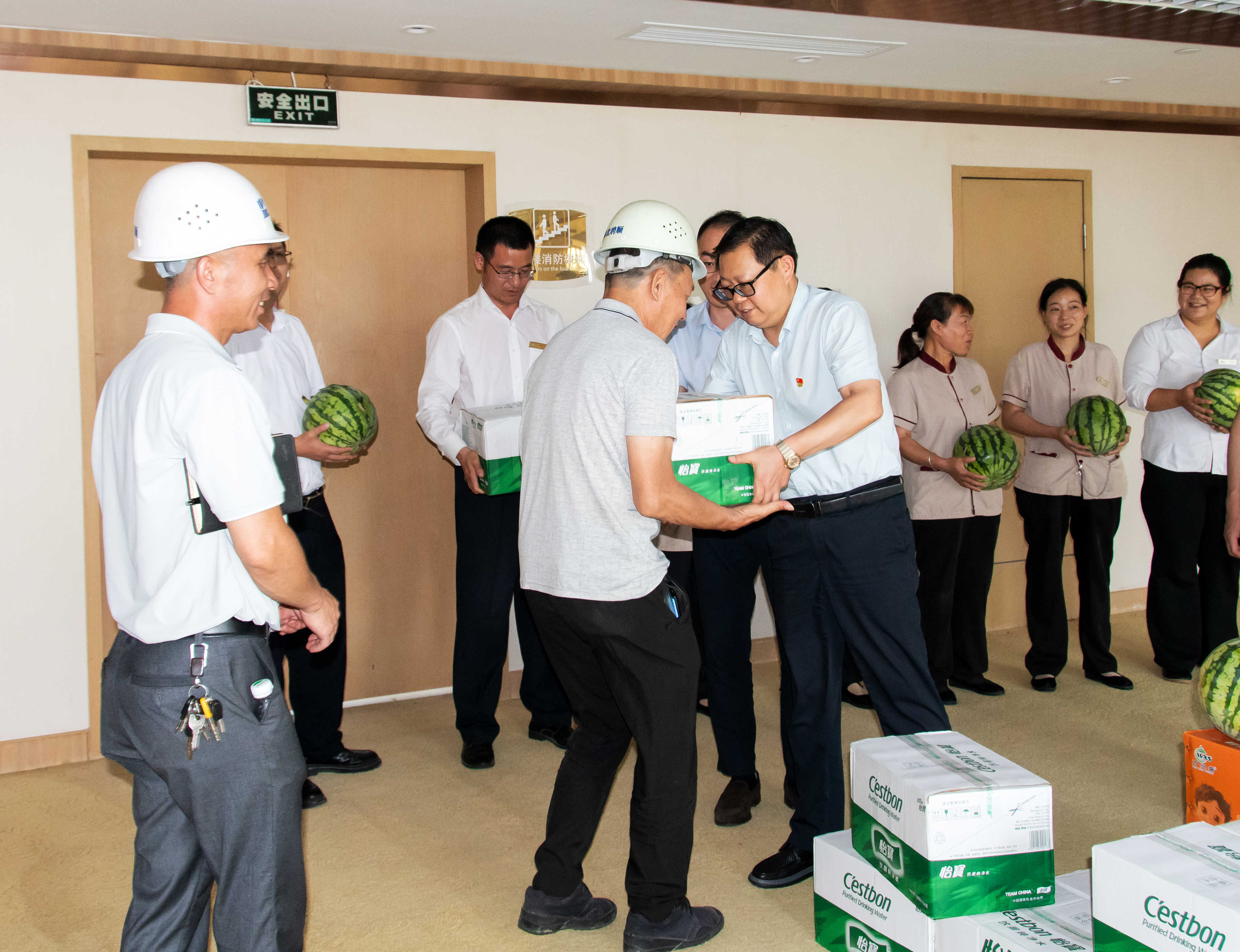 随后,吴传彪一行查看了酒店客房维修及餐厅改造情况,与现场工作人员亲切交流,并为一线员工送去矿泉水、西瓜等防暑降温物资,叮嘱他们在高温天气下要注意休息、劳逸结合。